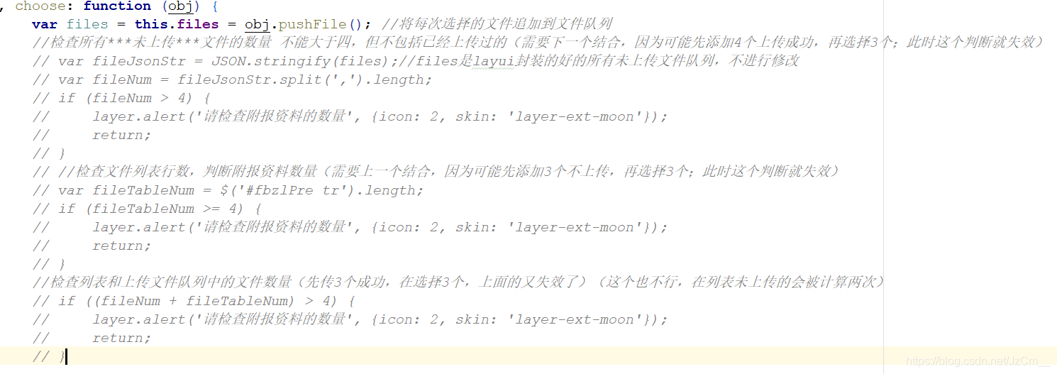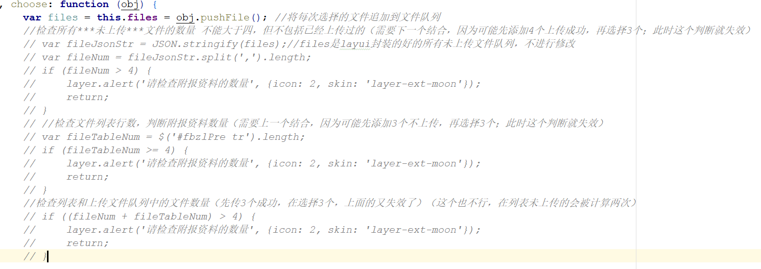 }- 第三个问题(上传数量限制):使用layui虽然能限制,但是只是限制所有未上传文件的数量,假设限制4,如果先上传3个成功,在选择3个,并上传是允许的。可能就不是想要的效果,所有文件总数的限制了。马上贴出js代码