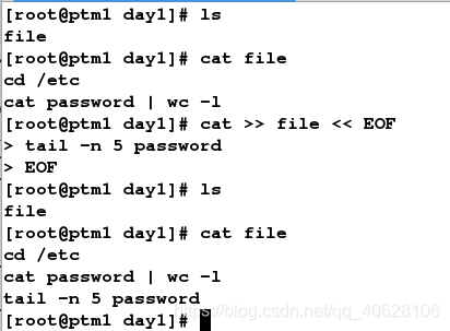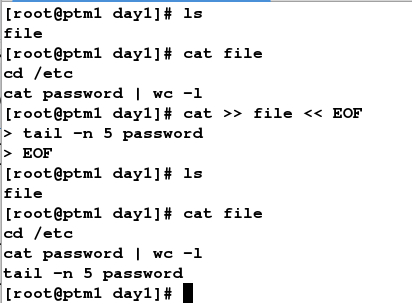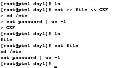 | cat >> file << EOF(结束标志) | 和上一条功能类似,不同之处有两点,一是使用方法不同,二是若file存在,则编辑的内容追加到原文件的后面 |