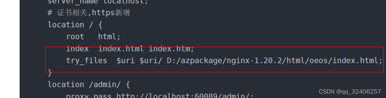 try_files $uri $uri/ D:/azpackage/nginx-1.20.2/html/oeos/index.html;