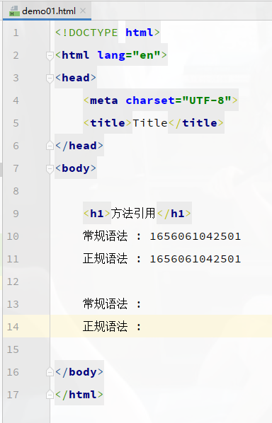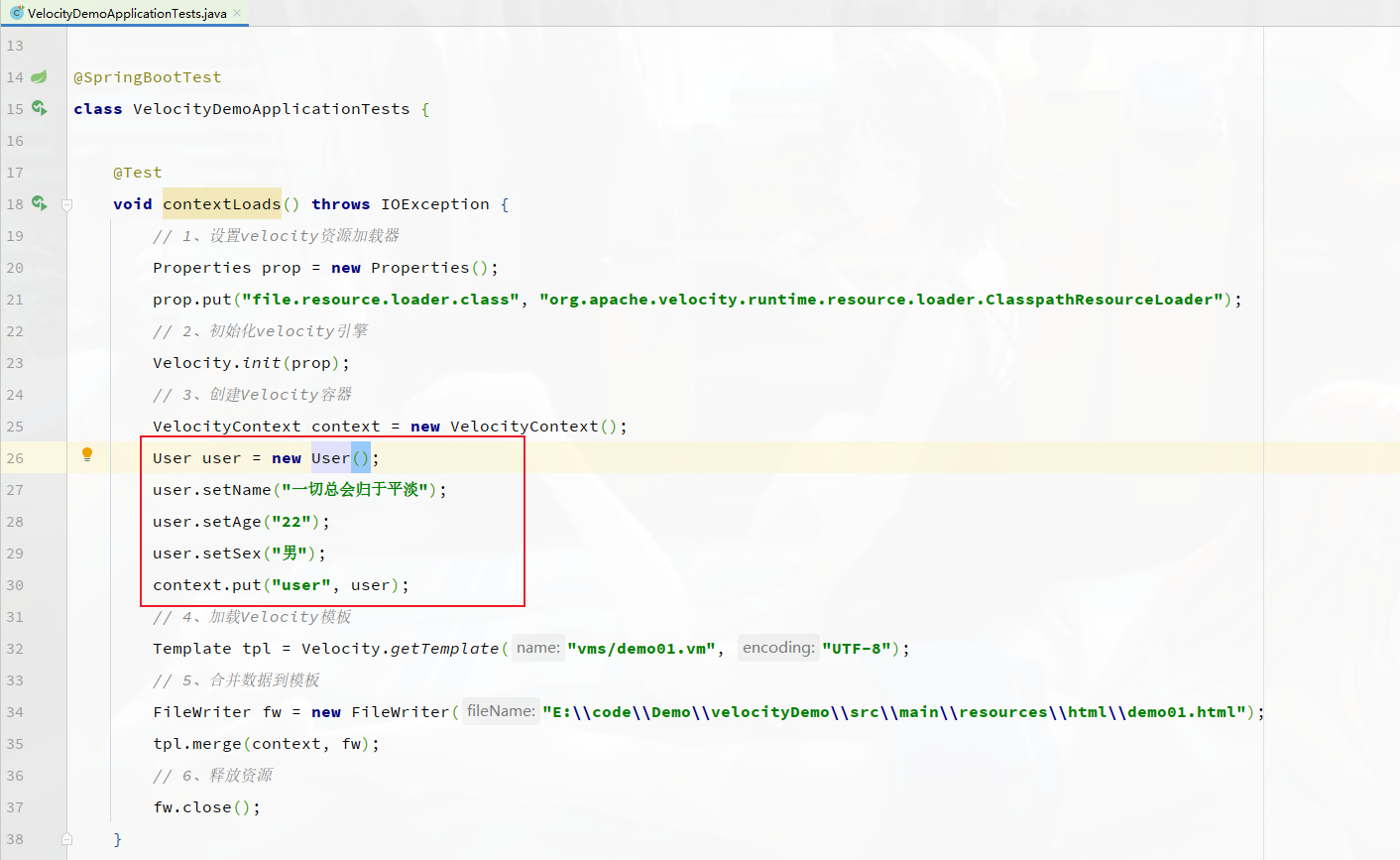 </html>模板创建好之后,我们到Test 类中,编写java 代码。