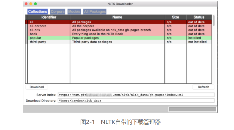 >>> nltk.download()运行上述命令,将弹出一个新窗口,询问我们要下载哪个包或语料库,如图2-1所示。
