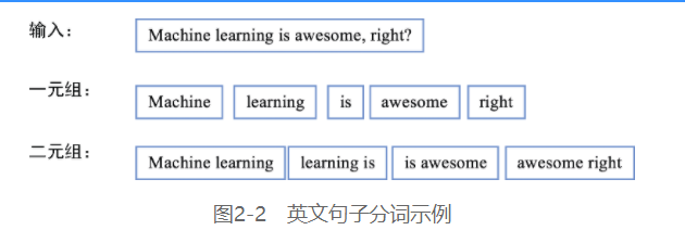 - 分词(tokenization):分词是指将给定文本序列切分为用空格隔开的字符片段,通常还会捎带删除标点、数字和表情符号。分词得到的这些字符片段称为词串(token),留待进一步处理。一个单词组成的词串,在计算语言学中称为一元组(unigram);原文中紧邻的两个单词组成的,称为二元组(bigram);3个连续的单词组成的,称为三元组(trigram);