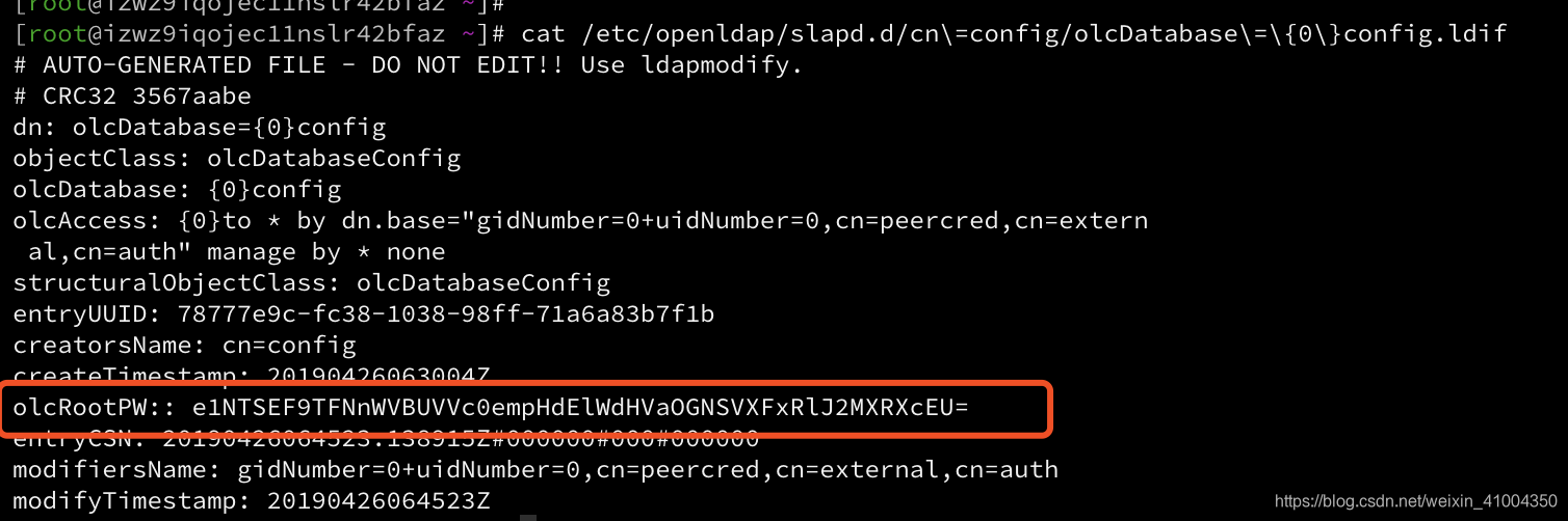# 在执行下面的命令前,你可以先查看原本的olcDatabase={0}config文件,里面是没有olcRootPW这个项的,执行命令后,你再看就会新增了olcRootPW项,而且内容是我们文件中指定的值加密后的字符串