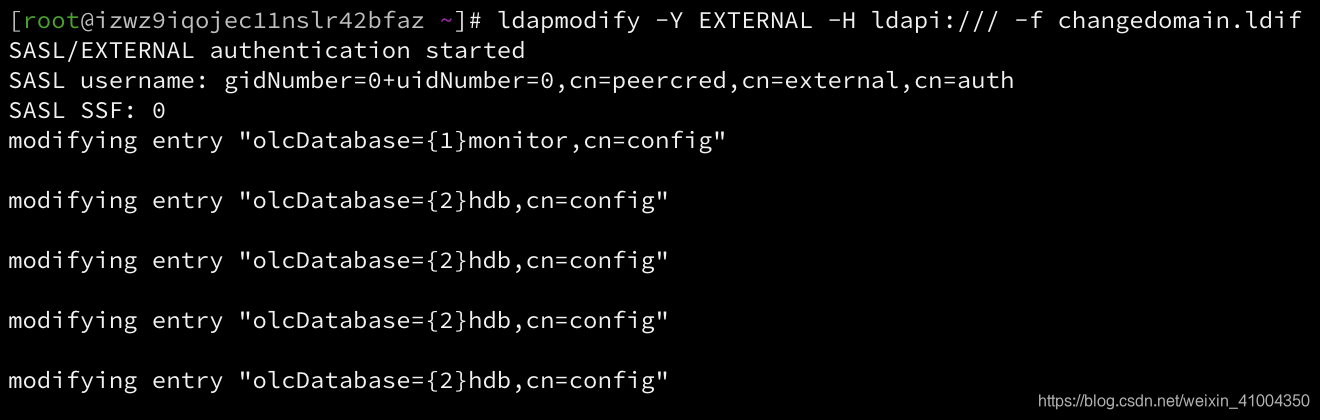 ldapadd -Y EXTERNAL -H ldapi:/// -f changepwd.ldif执行修改命令后,有如下输出则为正常: