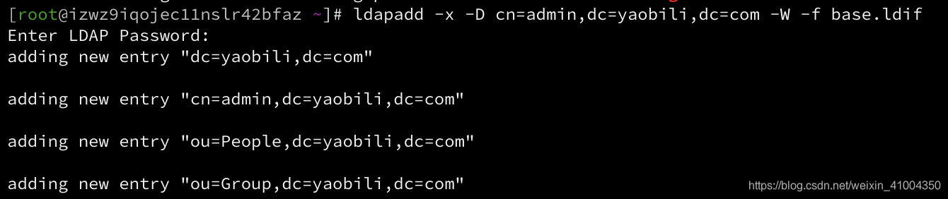 ldapadd -x -D cn=admin,dc=yaobili,dc=com -W -f base.ldif