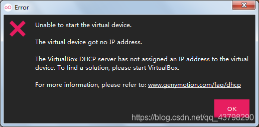 之前下载完之后可以直接打开,不知道为什么最近突然就报错了。。之前有一次是网络问题,关了再连wifi之后就神奇的好了。。还有一次是在Android studio内部打不开,然后用Genymotion可以打开。。这几次是把Oracle VM VirtualBox卸载重装就好了。。然后现在升级到卸载重装在关掉也打不开。。然后现在直接打不开了。。。无奈百度搜了搜有人说是兼容性问题,但是这个对于我来说没有用