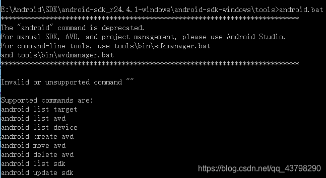 - 参考https://www.cnblogs.com/zhumai/archive/2012/04/18/2778378.html进入sdk下的tools然后输入android.bat