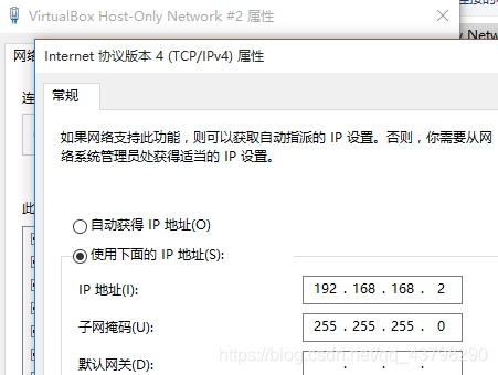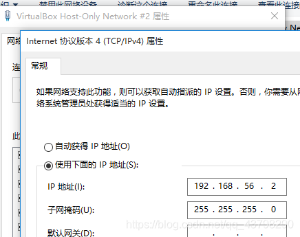 - 打开网络共享中心,查看你VirtualBox Host-Only Ethernet Adapter的IP是需要手动设置,IP为:192.168.56.X,子网掩码是:255.255.255.0(网上说的“VirtualBox:管理—>全局设定—>网络仅主机…确定其IP地址的正确性”我下载的virtualbox网络找不到,我猜测可能是版本不同,这里所说的IP地址相同)(我测试了几个192.168.X。2都可以,但是我发现这个IP会自己改变,但是还会打开)