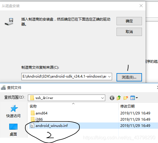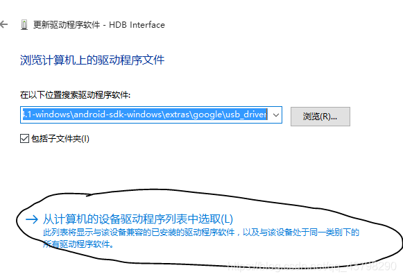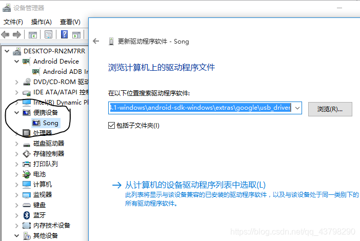 3.在控制面板中打开设备管理器,右击手机 ——>更新驱动程序软件——>选择第二个——>路径如图,是下载的usb driver