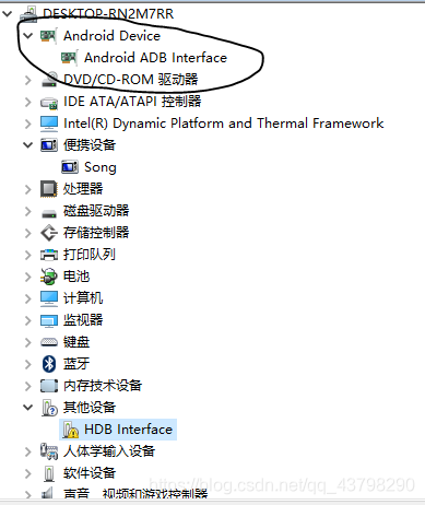4.在设备管理器中其他设备ADB有叹号(原本我这里有两个,一个是ADB一个是HDB Interface,后来两个均变成了HDB,不过应该没影响)