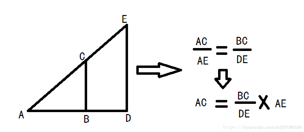 根据相似三角形,计算出AC,即目标物体的顶点沿着光照方向到达阴影接收平面的距离;
