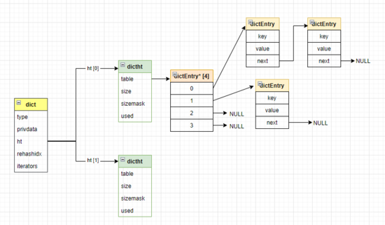 - Redis 字典使用的时哈希表作为底层,并且每个字典维护了两个哈希表,ht[0] 时主要使用的哈希表,而ht[1] 是在rehash过程是才会使用到的表。