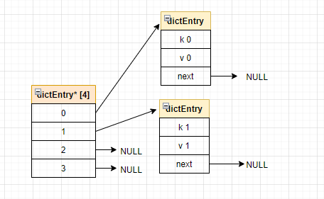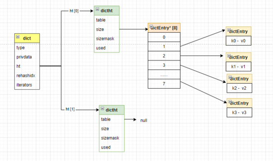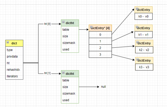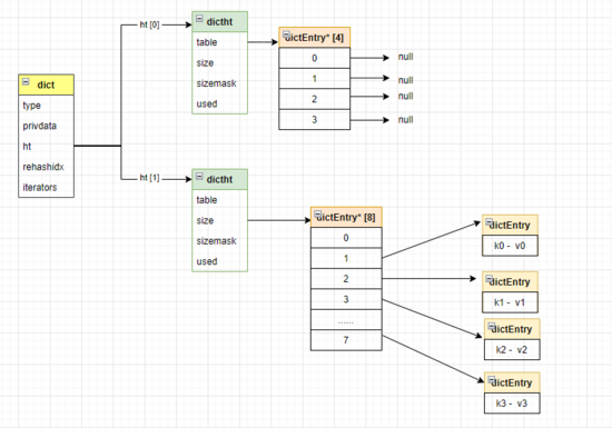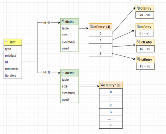 - ht[0].used 是4,4*2 = 8 ,2的3次方8 是第一个大于4的 2的n次幂。即程序会将ht[1] 的大小设置成8 ,并分配空间,结构示意如下: