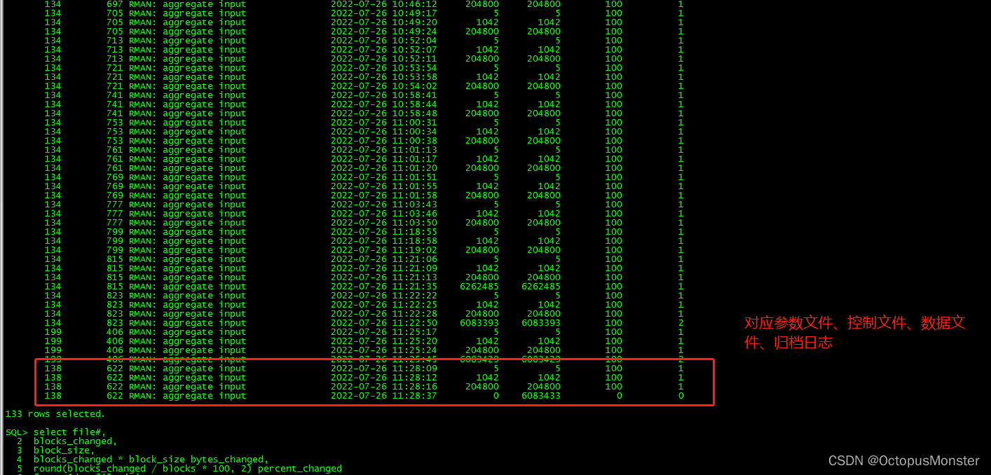 where opname like 'RMAN%' order by start_time asc;结果如下:(sofar为已完成块数量,totalwork为总备份块数量<单位为8K>。。。其中参数文件、控制文件、数据文件、归档日志的进度各自独立)