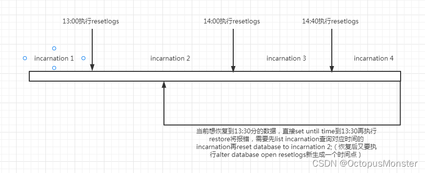 注:每次alter database open resetlogs; 其中的resetlogs参数将强制修改控制文件的scn变更为指定时间点的scn+1,恢复时间点until time不能在最近的resetlogs时间之前,否则将报错RMAN-20207且后续无法打开数据库。若要跨resetlogs恢复,需要先执行list incarnation; 查询对应时间段的incarnation N再执行reset database to incarnation N操作即可正常恢复。(resetlogs可看做时间轴上的断点,incarnation可看做每个resetlogs断点间的段落id)