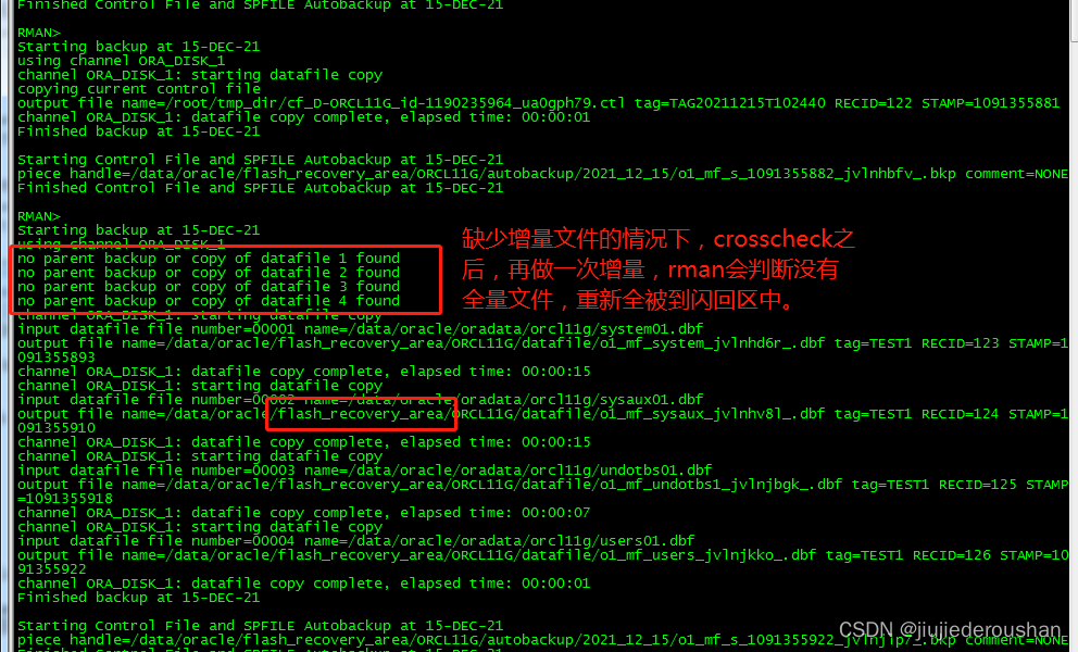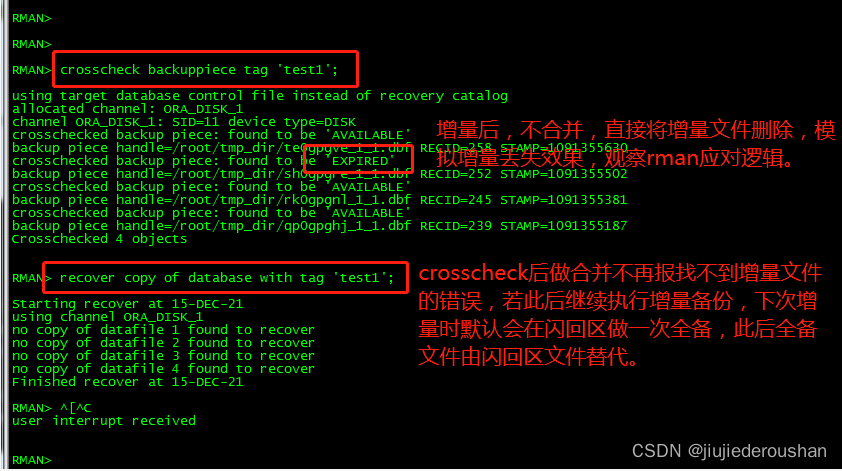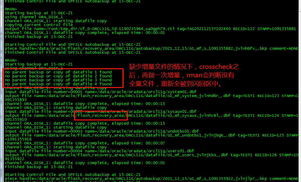 - 亦可使用crosscheck backuppiece tag 'tagname';检查是否有增量备份片过期,若存在过期的记录,则需要重新全备。若不执行重新全备,下次做增量时rman执行到recover copy of做合并时会判断没有全备文件,会自动在闪回区完成一次全备,以前使用的全备文件则不再关联。没有备份片过期,则再做一次增量即可。