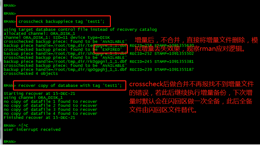 执行backup as copy increment level 1 for recover of copy with tag 'full_bak' database;后直接将增量文件删除,进行recover copy of合并时将报错no such file。执行交叉校验后将修改该备份片的状态为失效,后续默认会在闪回区再做一次全备。