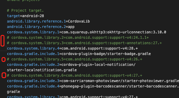 1、(此解决方案欠妥,我是用的后者解决的)去到项目目录的platforms/android/project.properties文件中,找上图报错内容中“com.android.support:support-xxx”错误的全给他注释掉,如我对应的