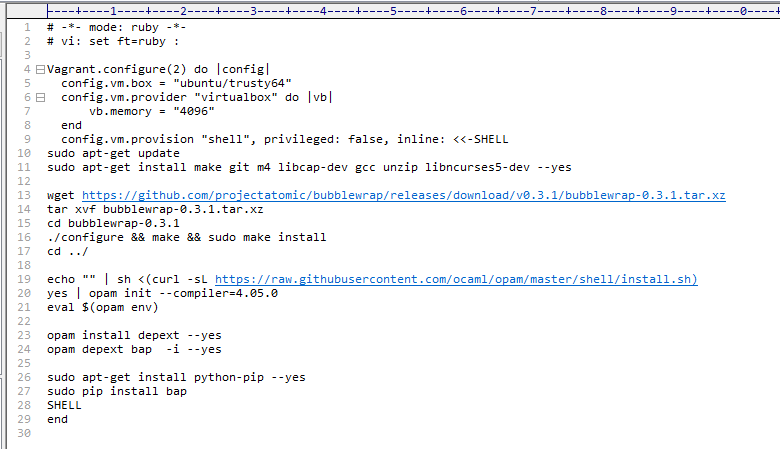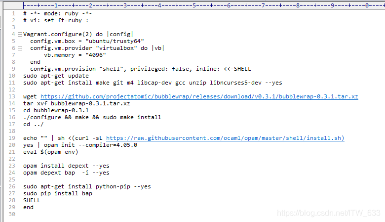 首先需要我们在github上下载我们的项目文件,如果该项目支持vagrant的话,一般会在根目录下存vagrantfile文件。我们打开这个文件,可以看到里面是虚拟机的一些配置文件,