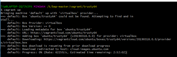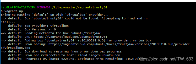 我们可以看到下载这个镜像文件需要7个小时,我们建议离线下载,找到default:Downloading:后面的链接地址,然后在迅雷里面打开。两分钟基本就下载好了,我们记住镜像所在的路径,比如这里ubuntun/trusty64,然后我们关掉上面的命令,重新输入如下命令:注意把我们下载的box放到vagrantfile所在的目录下。