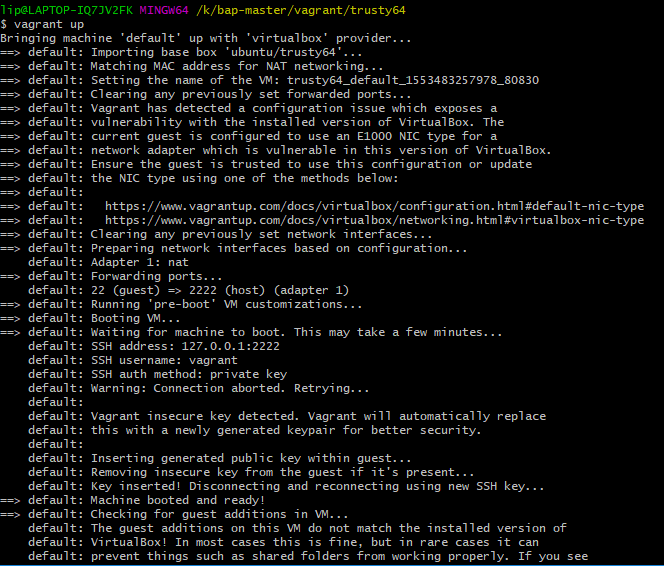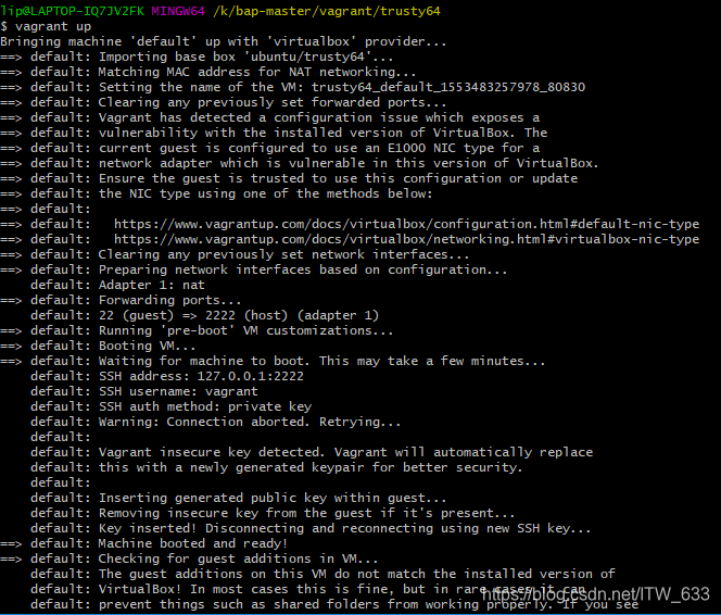 然后我们的box已经添加成功,接下来输入vagrant up启动我们虚拟机进行配置