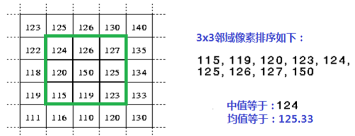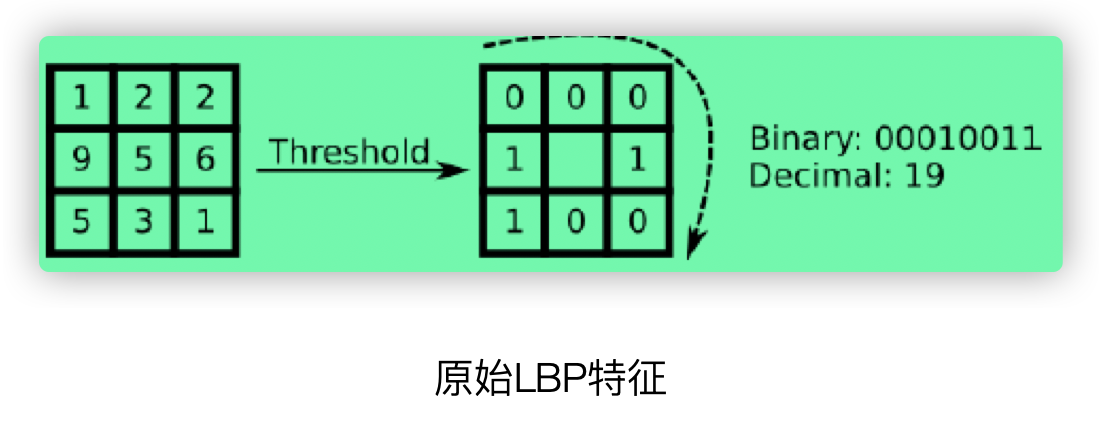- 在灰度图片中,在3x3的像素邻域内,以中心像素作为阈值T,将中心点的8邻域像素的8个数值,分别和T进行比较,若大于T则置1,小于则0