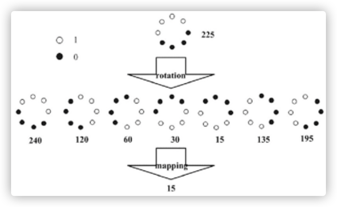 - 对于CircularLBP所述的圆圈覆盖的邻域像素,按照一定步长进行角度旋转,得到一系列的序列(下图白点为1黑点为0),转换成LBP值,则每个像素点会有多个LBP值