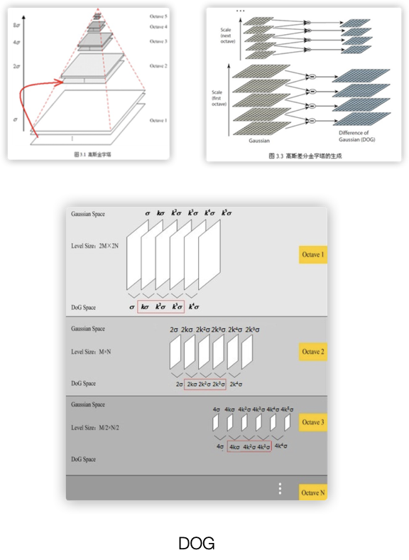 建立尺度空间主要分成两步,第一步是对图片进行Gaussion金字塔操作,正常的pyramid每做一次下采样就是1层,但这里叫做一组,对每一组的图片,按照模糊尺度进行分层,第二步就是把每一组中上下层图像进行像素差分操作,得到高斯差分金字塔DOG金字塔