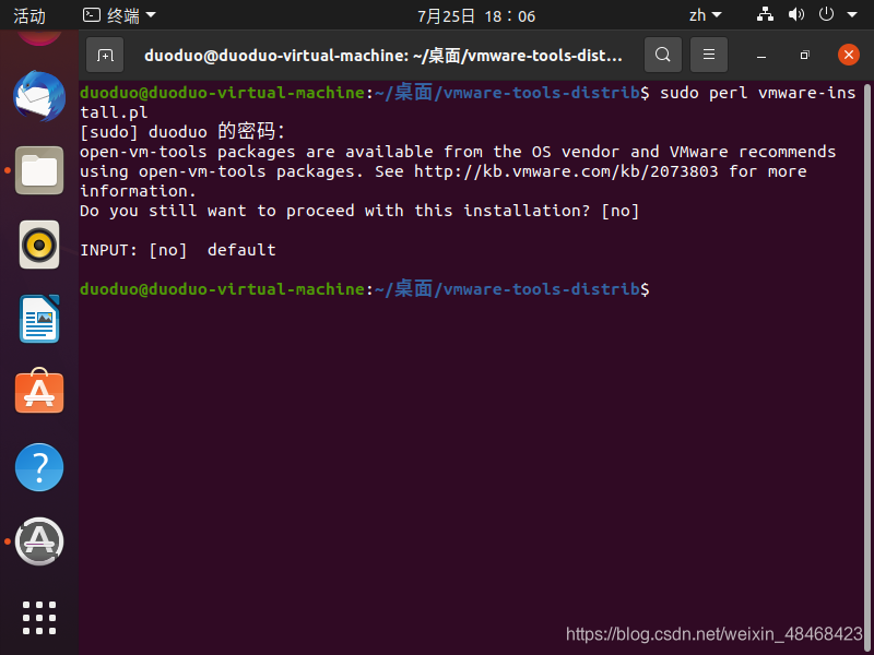 首先再终端的命令行输入sudo perl vmware-install.pl