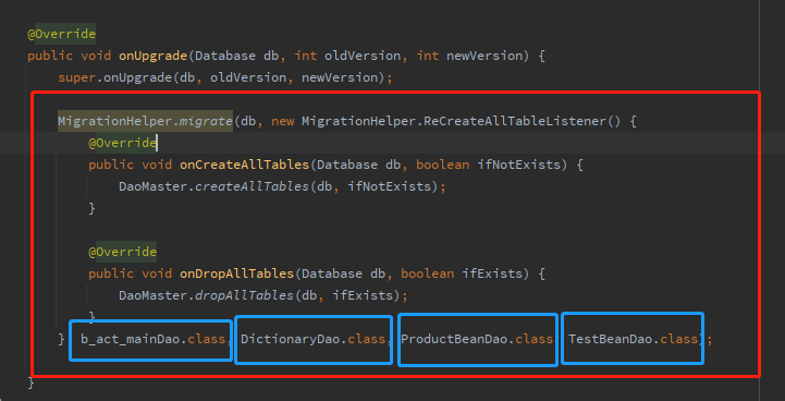 2.新建SQLiteOpenHelper继承DaoMaster.OpenHelper并实现里面的接口方法
