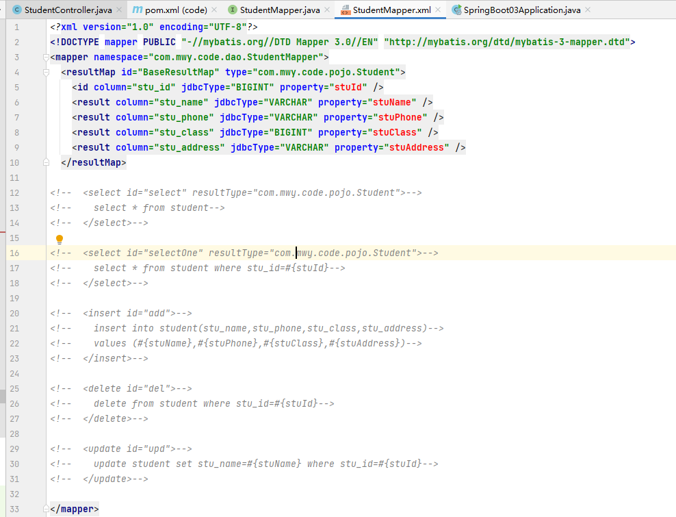 ⑤、注掉StudentMapper.xml中方法