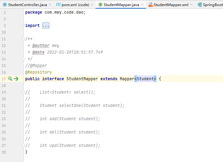 ④、注掉StudentMapper.java中方法,继承Mapper与Student挂钩