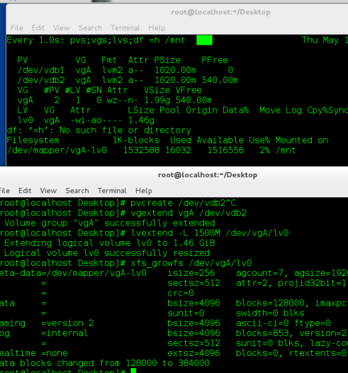 lvextend -L 500M /dev/vg0/lv0 将lv0扩展至500M 是从vg0中获取的 然后格式化 为避免原有数据的损失需要 xfs_growfs /dev/vg0/lv0 进行格式化