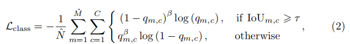 其中, M^和 N^分别表示留下来proposal的数量和在这其中正样本的数量。IoUm,c表示第m个proposal与第c个类别中所有gt bbox之间最大的IoU值。τ表示IoU的阈值保持不变(设置为0.7)。qm,c表示第 m m m个目标中第c个类别的分类分数。β=2与α=2相似的作用。