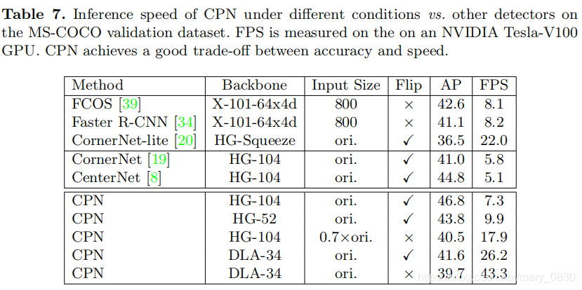 在相同的设置下,CPN-104的FPS/AP为7.3/46.8% 比CenterNet-104 5.1/44.8%,速度极快,效果又好。