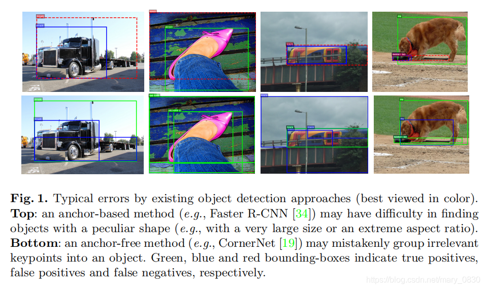 第一行:基于anchor-based方法(faster rcnn)很难找到具有特殊形状的目标(比如大尺寸目标、目标的横纵比例很大),并且没有得到更高的召回率。