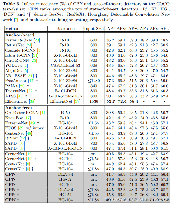 “R”、“X”、“HG”、“DCN”和“†”分别表示ResNet、ResNeXt、Hourglass、可变形卷积网络和多尺度训练或测试。