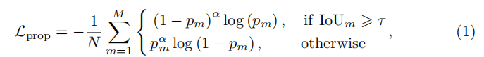 其中, N表示正样本的数量,pm∈[0,1],pm∈[0,1]表示第m个proposal的置信度分数,IoUm表示第m个proposal与所有gt bbox之间最大的IoU值。τ表示IoU的阈值(设置为0.7)。α=2表示平滑损失函数的超参数, π=0.1。