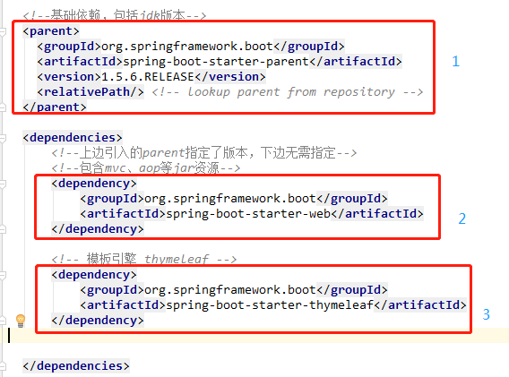 parent标签是springboot的基本依赖,下面的dependency都是继承自它。2是引入开发web项目必要的jar包,3是thymeleaf模板的依赖。