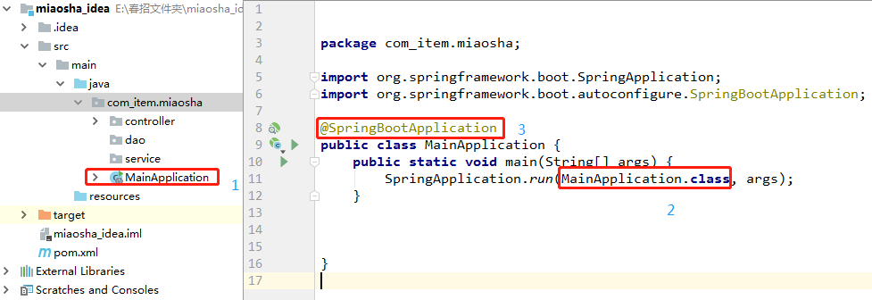 启动工程需要有入口,要自己创建一个启动类。该类位于工程包的根目录下,用该类的类对象作为参数传入main函数中。同时在类上添加@SpringBootApplication注解。