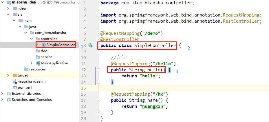 controller类中创建一个类,类名上带有Controller便于识别。类中的每个方法对应一个url,类上和方法上的@RequestMapping共同制定这个url。@RestController表明该类中的所有方法均返回方法的返回值。