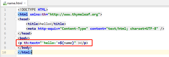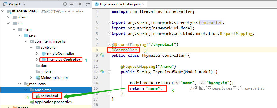 不能使用RestController注解,它会返回rest接口形式,想要返回resources中的文件用@Controller注解。用Model对象将name.html 中的 name赋值为“huangxin,最后返回该接口返回name.html文件。