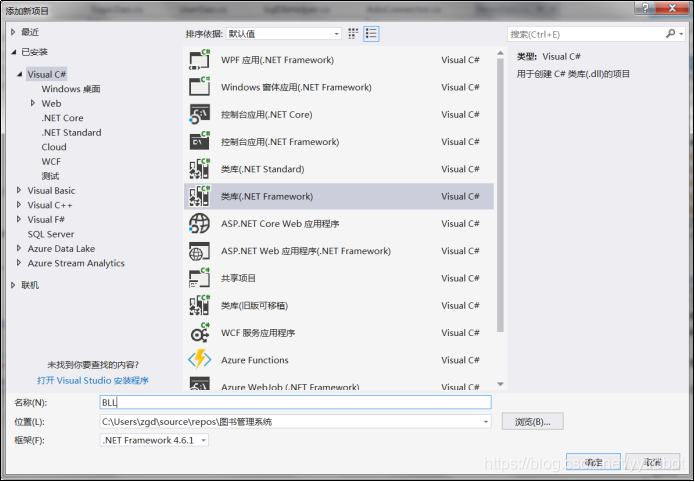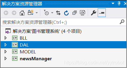 右击解决方案,添加新项目,选择C#类库,分别完成BLL、DAL、Model、视图层创建.