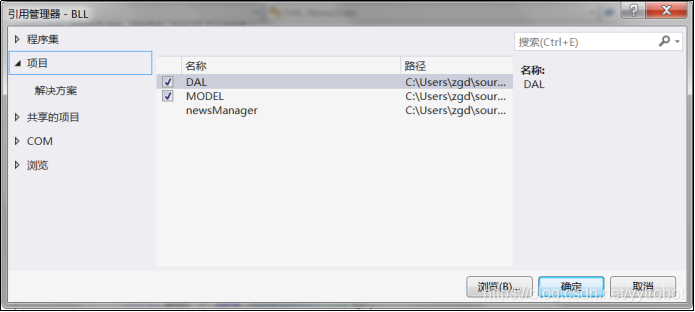 添加引用,BLL层需要引用DAL和model层,DAL层需要引用model层,视图层需要引用BLL和model层