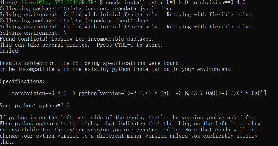 遇到的问题:此处显示python=3.8不适用torchvision==0.4.0