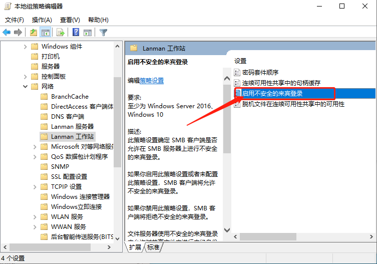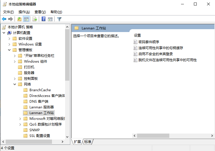 2、进入 :计算机配置 >> 管理模板 >> 网络 >> lanman工作站