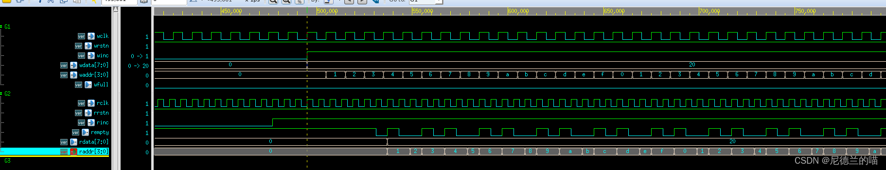 把所有文件放置于async_fifo目录下,键入auto_verification -f async_fifo,生成仿真环境,简单修改testbench,得到如下波形: