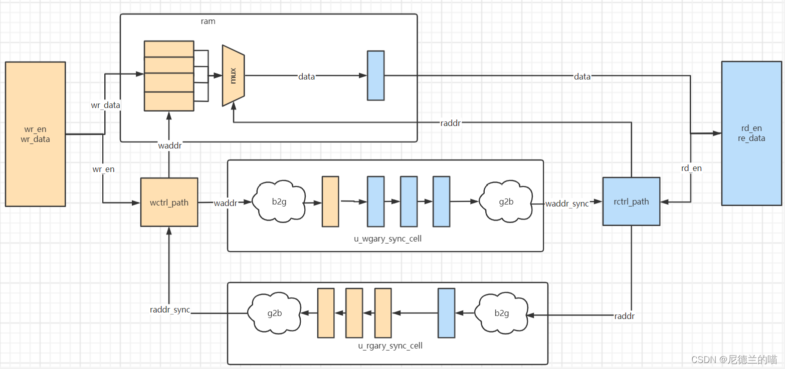整体的思路很常规,模块分为四个部分:写通路控制、读通路控制、异步单元、双口RAM。