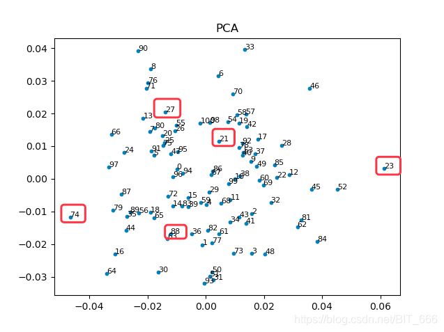 我们可以把原始的图看作是3维的用户关注关系,PCA(n_components=2) 看作是我们从某个视角观测且想要尽可能多的观测到的二维最全面的节点全貌,可以通过图中标识出的顶点去大致抽象一下这个降维过程。