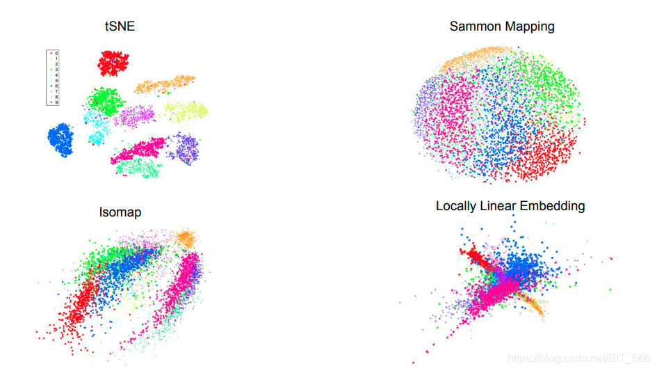 以手写数字数据为例,可以看到 T-SNE 的分类效果对于单类别特征更佳局促,可视化效果更好,体现了其在刻画局部特征的特点。
